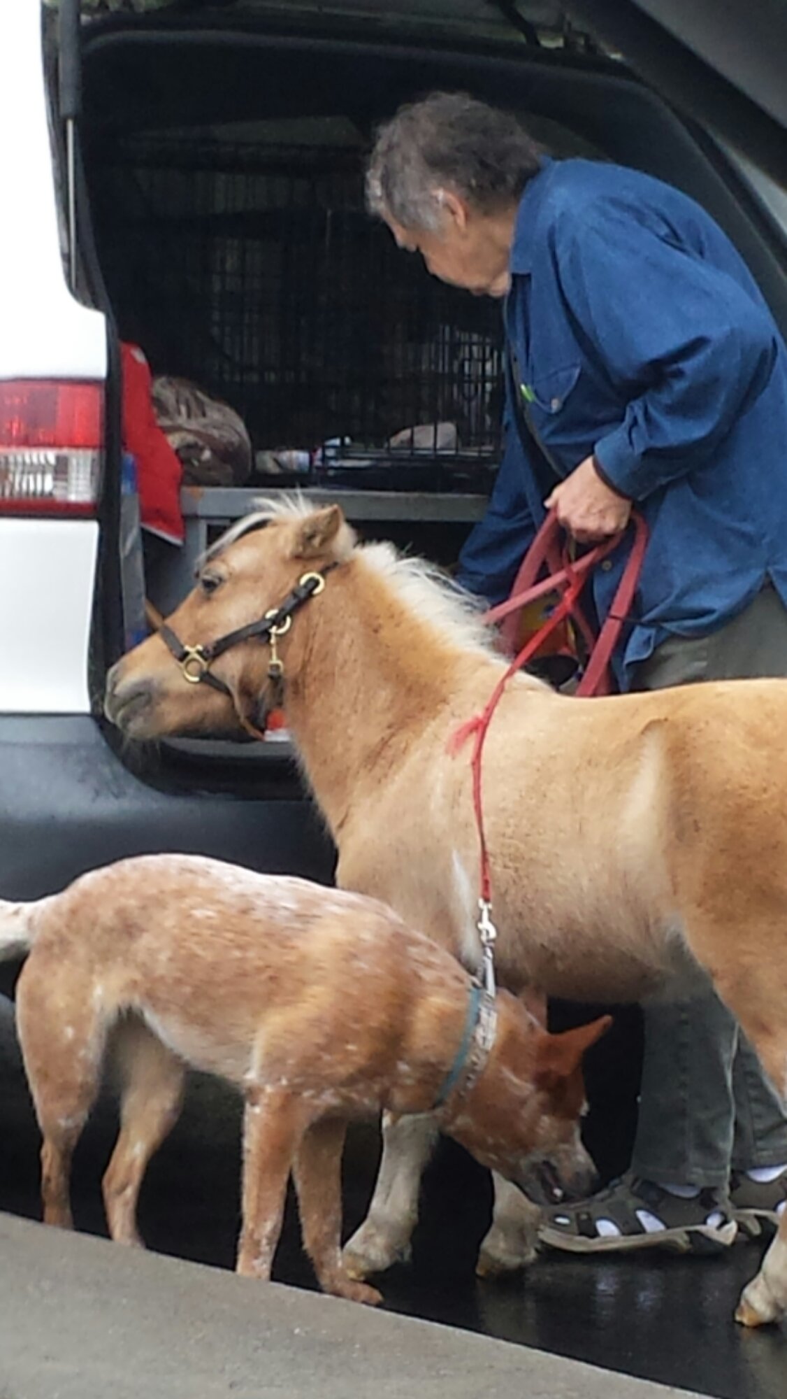 Today, on my way to the morning ferry, I saw a woman walking two dogs and a pony. I asked Kelley to pull around so that I could take a picture of her (for the blog). When we pulled around the store, we could see her loading up the animals in the car (see inset picture). As we rolled down the window and took the picture, we could hear her telling another lady that the pony was “completely housebroken.”
