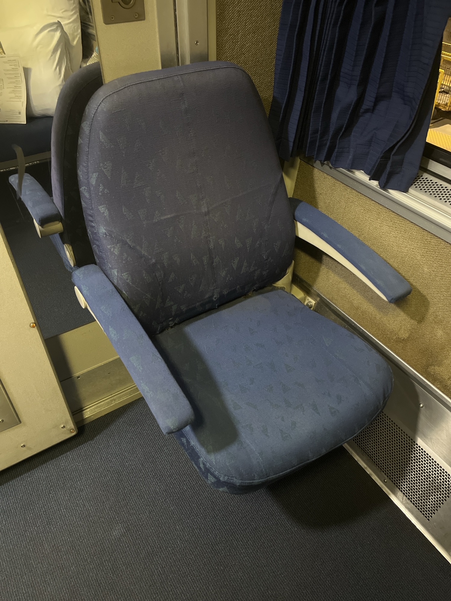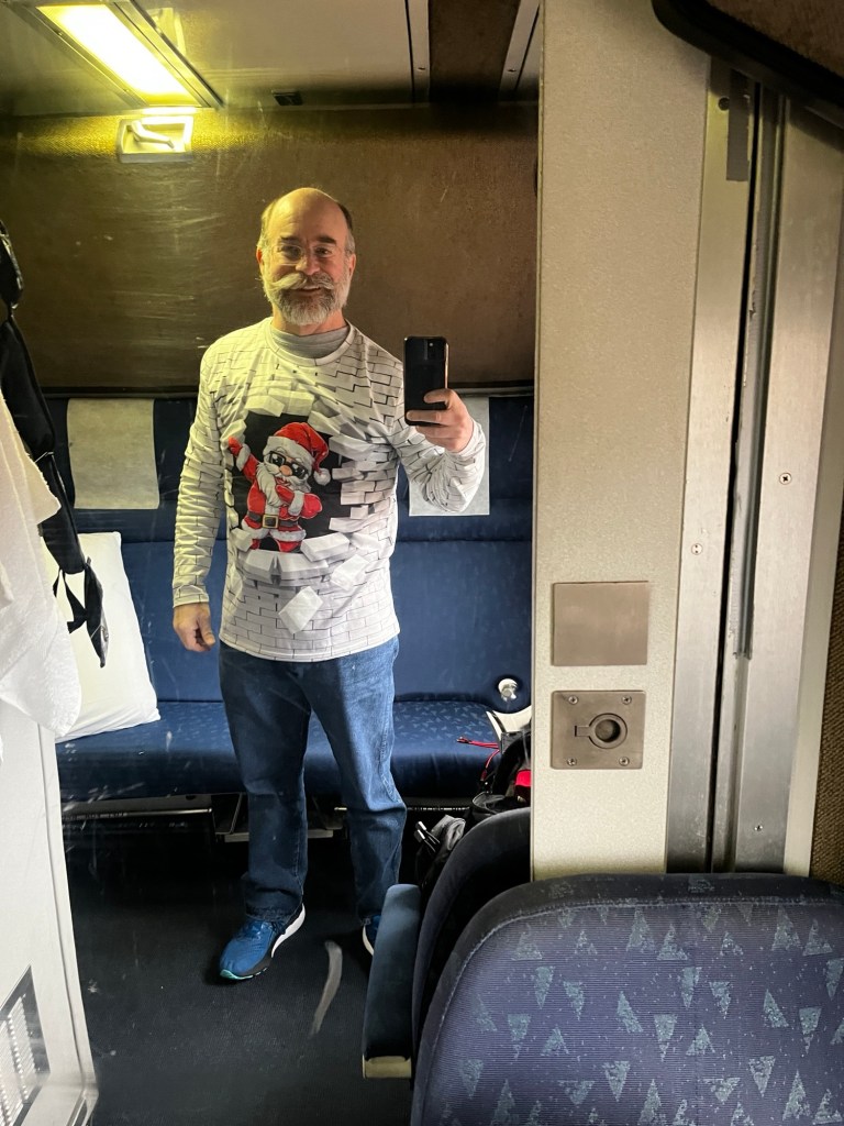 The trip from Chicago is different. For one, I have the bedroom instead of a roomette. This gives me a toilet/shower, a sink, and a sitting chair across from a full-length couch. The couch slides out to become a bed with a sleeping pad like the one in the roomette but doesn’t consume the chair (and leaves some space to stand).